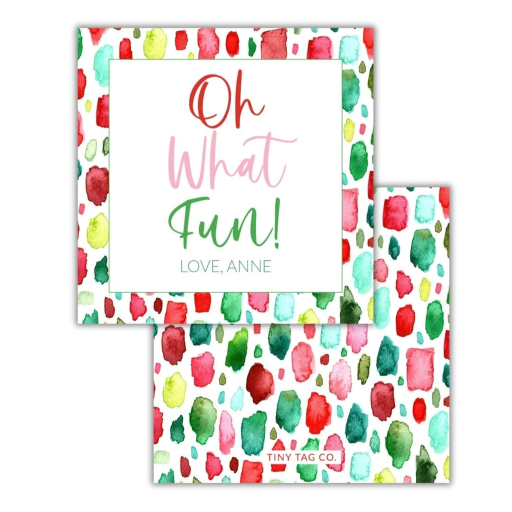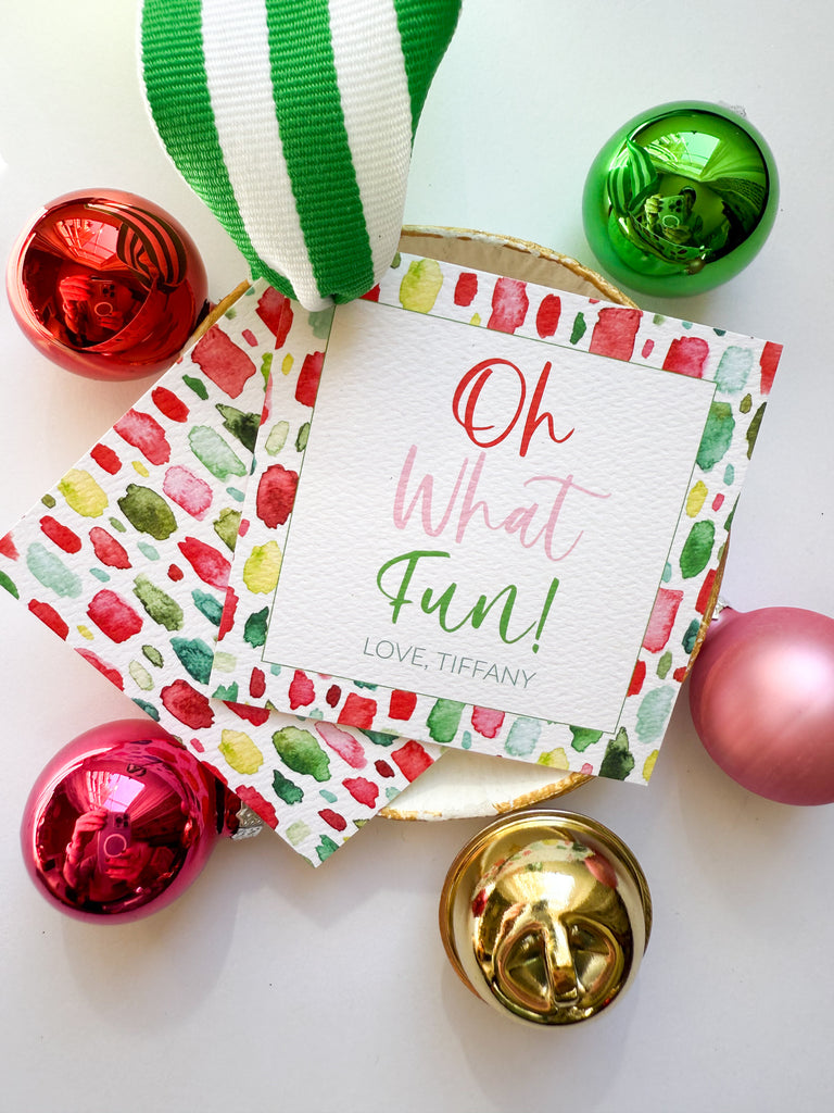 These 2.75" tags come with a pre-drilled hole in the upper left corer. These are also available as a matte sticker. They are printed on heavy cardstock. We suggest browsing our favorite ribbons and trims in the Amazon shop here to make this design truly shine.