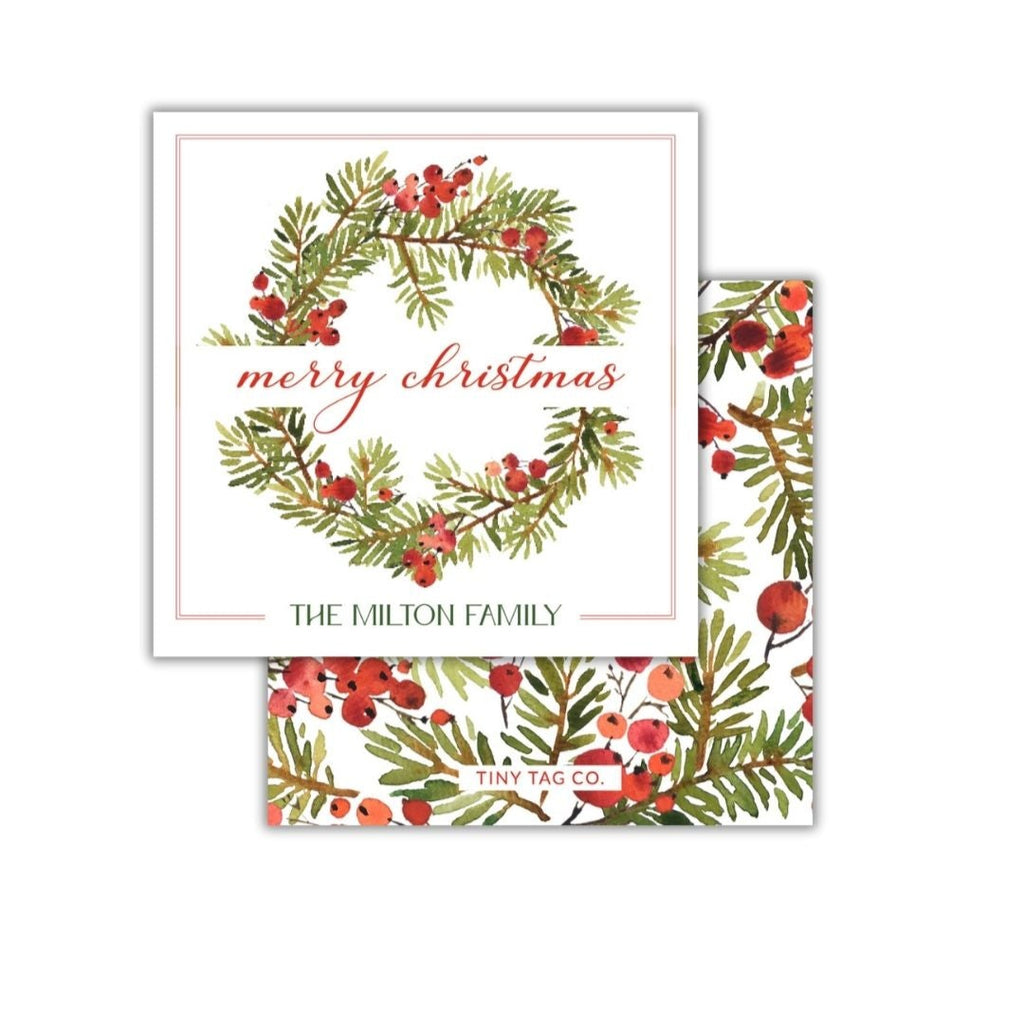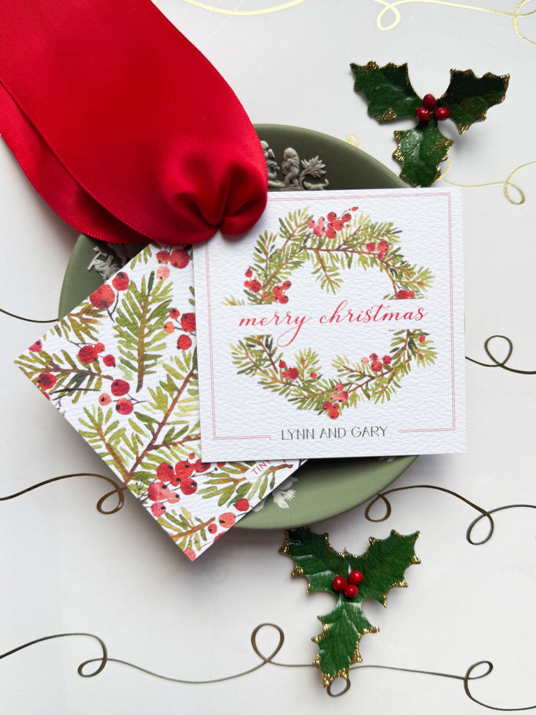 These 2.75" tags come with a pre-drilled hole in the upper left corer.  These are additionally available as a 2.75" matte sticker. They are printed on heavy cardstock. We suggest browsing our favorite ribbons and trims in the Amazon shop here to make this design truly shine.